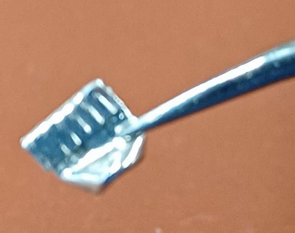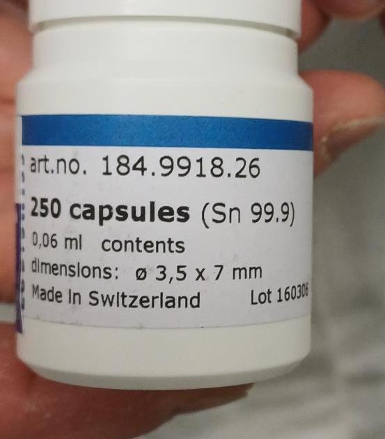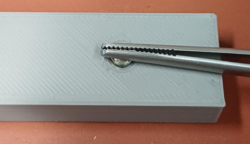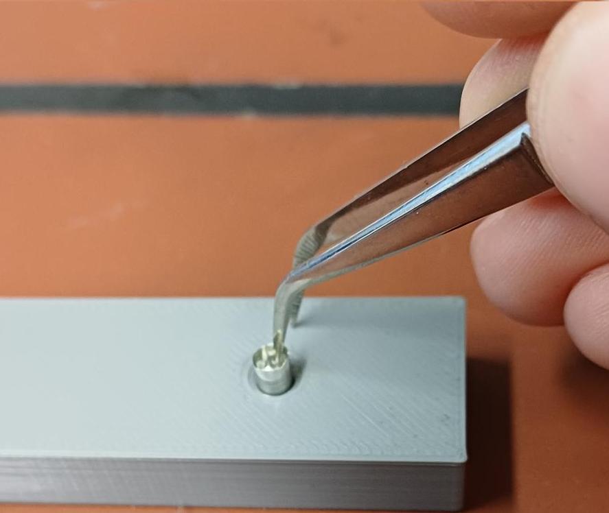 Use the pointed tweezers to place one capsule into the holder. The holder is a small piece of metal or polymer with a hole just large enough for the capsule (dimensions: 3.5×7 mm). I also created a 3D-printable model..