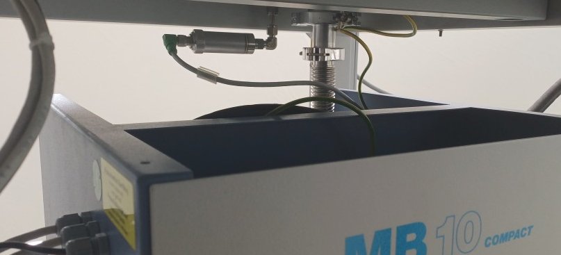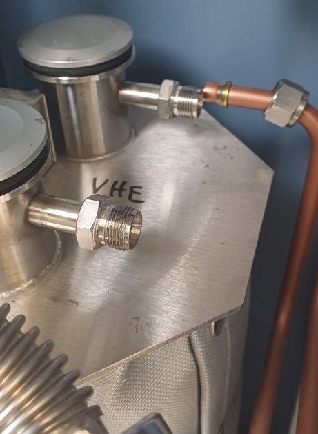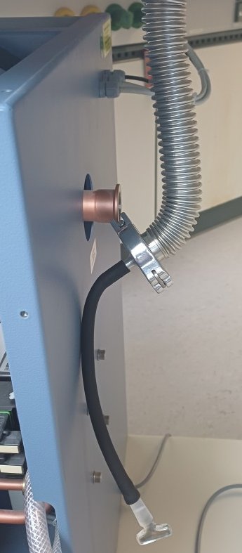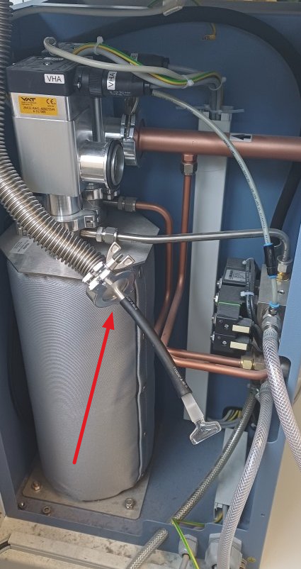 Beware: The moment the metal output hose (red arrow, Figure 4) is detached, the box will be open to air and the pressure inside it will drop. It is advisable to keep a plug nearby to immediately plug it. By doing so the introduction of air into the box will be minimal. In this case a proper plug was not at hand so the solution was improvised.