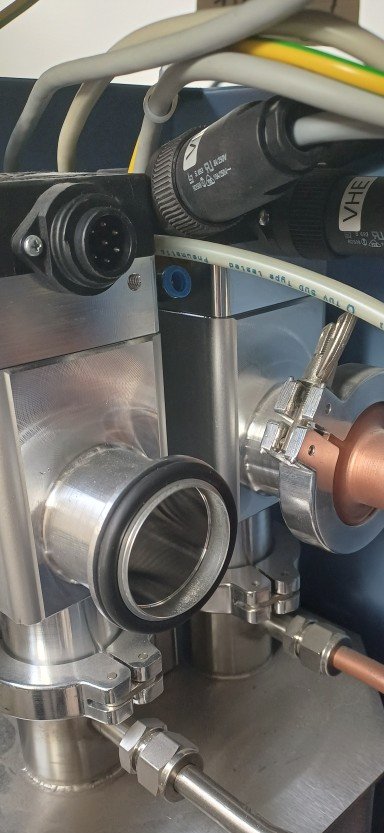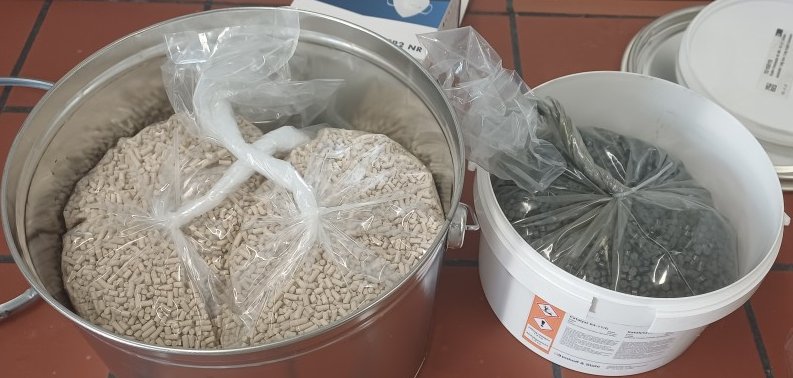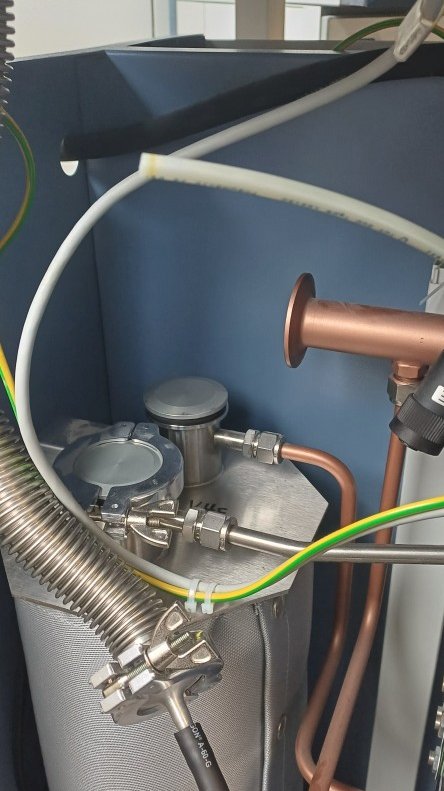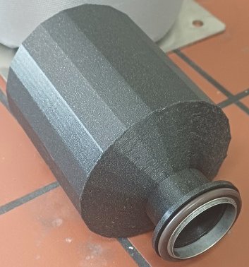 After this prepare the new reactor loading. Usually the manufacturers of the boxes will provide refill sets for your specific systems (Figure 12(a)). In this case there are two bags of molecular sieves, one bag of catalyst and two rubber gaskets for the meshed sealing rings (Figure 12(b)). Replace the gaskets. To refill the reactor a suitable funnel is needed. For this purpose I 3D-printed a funnel with a KF40 flange which can be directly mounted onto the reactor (Figure 12(c)). The model is provided here (external link). Mount the funnel on the same flange where the old loading came out. Refill the reactor in a specific order: First a bag of molecular sieves, then the bag with the catalyst and lastly the second bag with molecular sieves. The reason for this order is that the catalyst would be packed between the molecular sieves and therefore additionally protected. Now that the loading is replaced everything needs to be put together in reversed order.