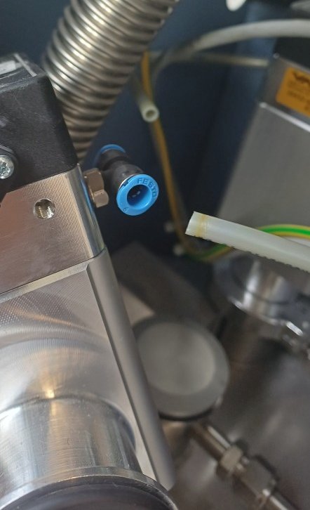Next the first pneumatic valve hast to be removed. To do this unscrew the washer on the electrical connector to disconnect it (Figure 5(a)). Disconnect the clamp at the flange and pull the valve carefully a little bit forward. You will notice the pneumatic connector with the pressure tubes at the back of the pneumatic valve (Figure 5(b)). To disconnect the valve push and hold the blue ring while carefully pulling the tube out (Figure 5(b)). Now you are able to remove the pneumatic valve (Figure 5(c)).