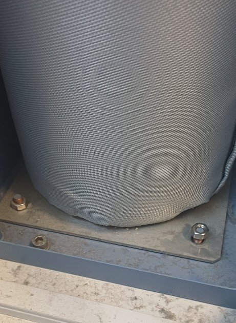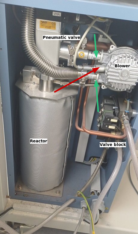 The big wrapped cylinder in the bottom left corner is the reactor. Attached to it are two pneumatic valves and the blower (Figure 3). The blower needs to be removed next. First disconnect the cable connected to it (red arrow). The connector is hold in place with a magnetic lock. The blower itself is only attached to the system via the two flanges (green arrows). So the blower is to be removed by opening the respective clamps on the flanges.