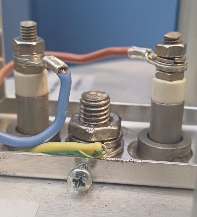 To detach the cable first remove the cover by loosening the two screws (Figure 9(a), red arrows). Now you can see the two powerlines (blue and brown) connected to the heater element and the ground (yellowgreen) connected to the reactor housing (Figure 9(b)). These unprotected contacts are the main reason why you disconnect the entire system from the power grid. To remove the cable unscrew the washers so the entire contact housing can be detached (Figure 9(c)).