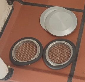 Remove the meshed sealing rings (Figure 11(a)) from the flanges of the reactor (Figure 11(b)) and empty it into the container (Figure 11(c)). The black pellets are the copper-based catalyst while the white ones are molecular sieves. For reasons mentioned before leave the old reactor loading to sit for a few days before you dispose of it.