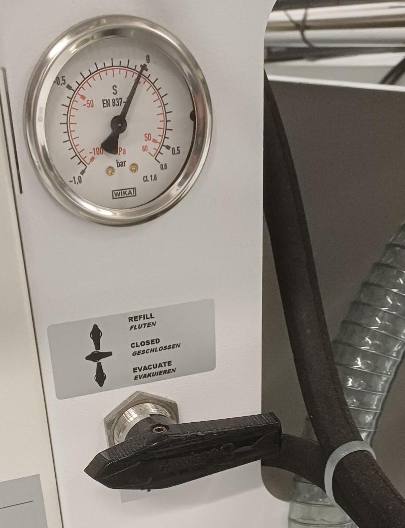 After refilling the solvent filter, it must be evacuated for several hours and then refilled with inert gas. This is necessary not only to remove the air inside the filter, but also to remove the high water content absorbed by the activated carbon. Manufacturers recommend two 9-hour vacuum sessions before putting the filter back into circulation. In my experience, leaving it on vacuum over the weekend also works. To do so, switch the lever on the three-way valve to the vacuum position (Figure 11(a)). To refill the filter with inert gas, switch the lever to the appropriate position. When the filter is inertized, close the valve by switching the lever to the middle position. The absorbed water from the activated carbon will partly condensate on the exhaust side of the vacuum pump. It is recommended to switch the pump to high throughput mode by turning the knob completely to the left (Figure 11(b)). For more details consult the pumps manufacturers manual. After the vacuum cycles are completed switch the mode back to high vacuum mode by turning the knob completely to the right. Also, if possible, leave the pump for some hours in gas ballast to flush out any remaining moisture.